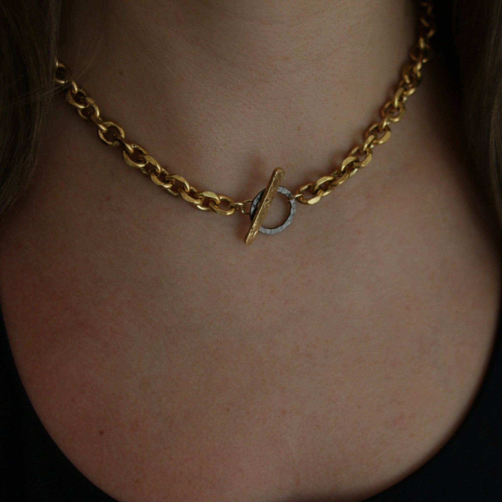 Amazing matte gold heavy chain or African Turquoise beaded chain make up this great short layer! The bar and circle are a fun way to top off this necklace and you can choose to wear it in the front or back.